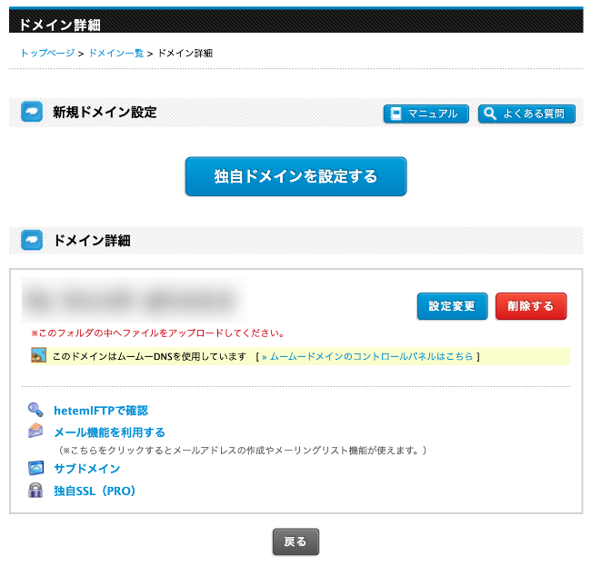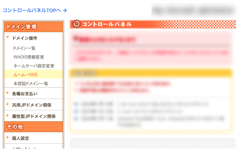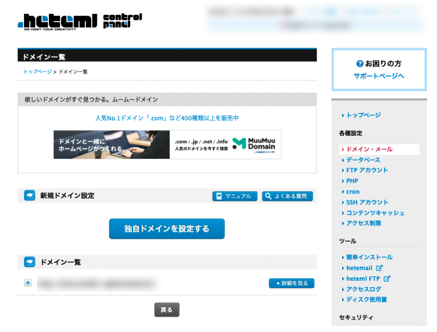次にヘテムルのコントロールパネルで、ムームードメインとの連携を行います。