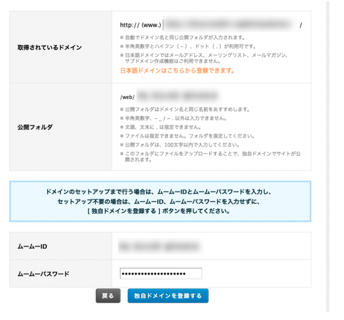 画面の案内に従い、ドメイン名やムームーIDを入力し連携を行います。