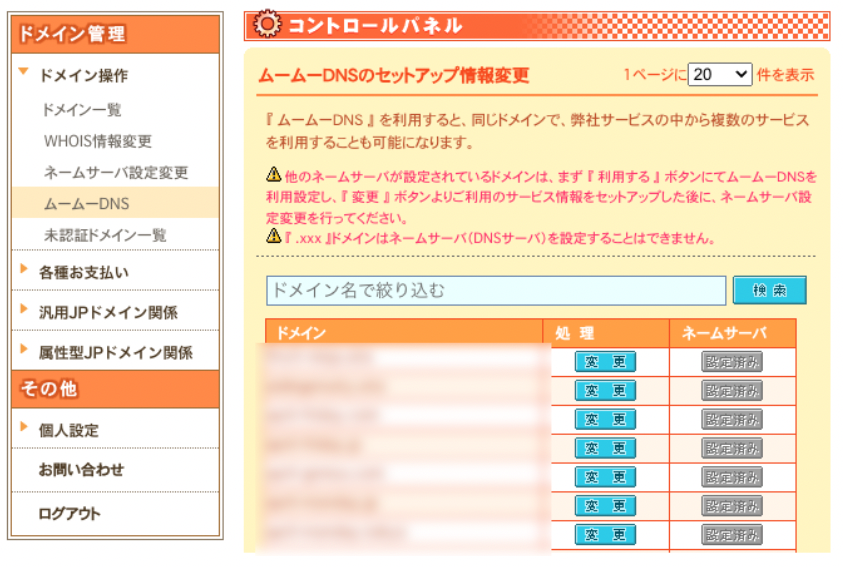 ドメイン一覧が表示されるので、対象のドメイン項目の「変更」をクリックします。
